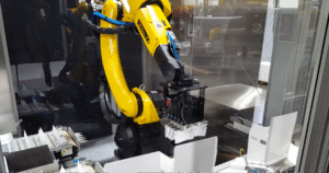 Our V30 Vertical Robotic Case Packer uses a FANUC M‑20 robot to load bottles, cartons, jars, or bags into RSC cases. It efficiently erects, collates, and seals cases with tape or optional hot‑melt glue.